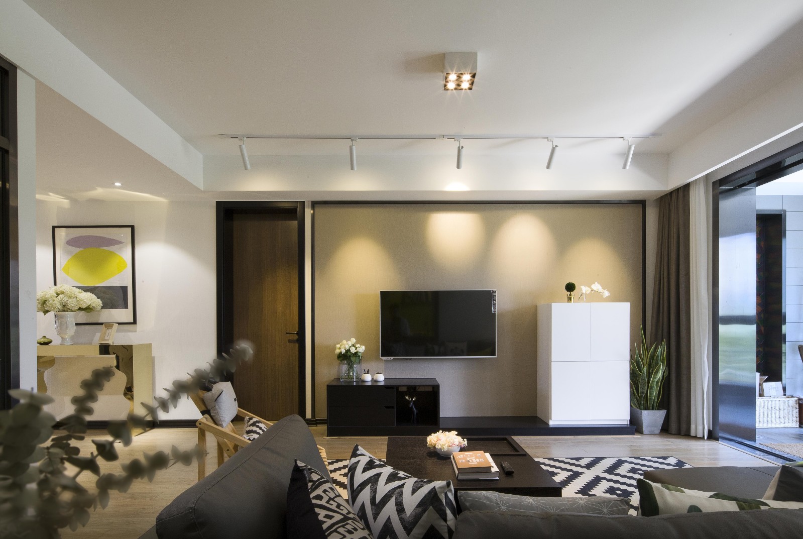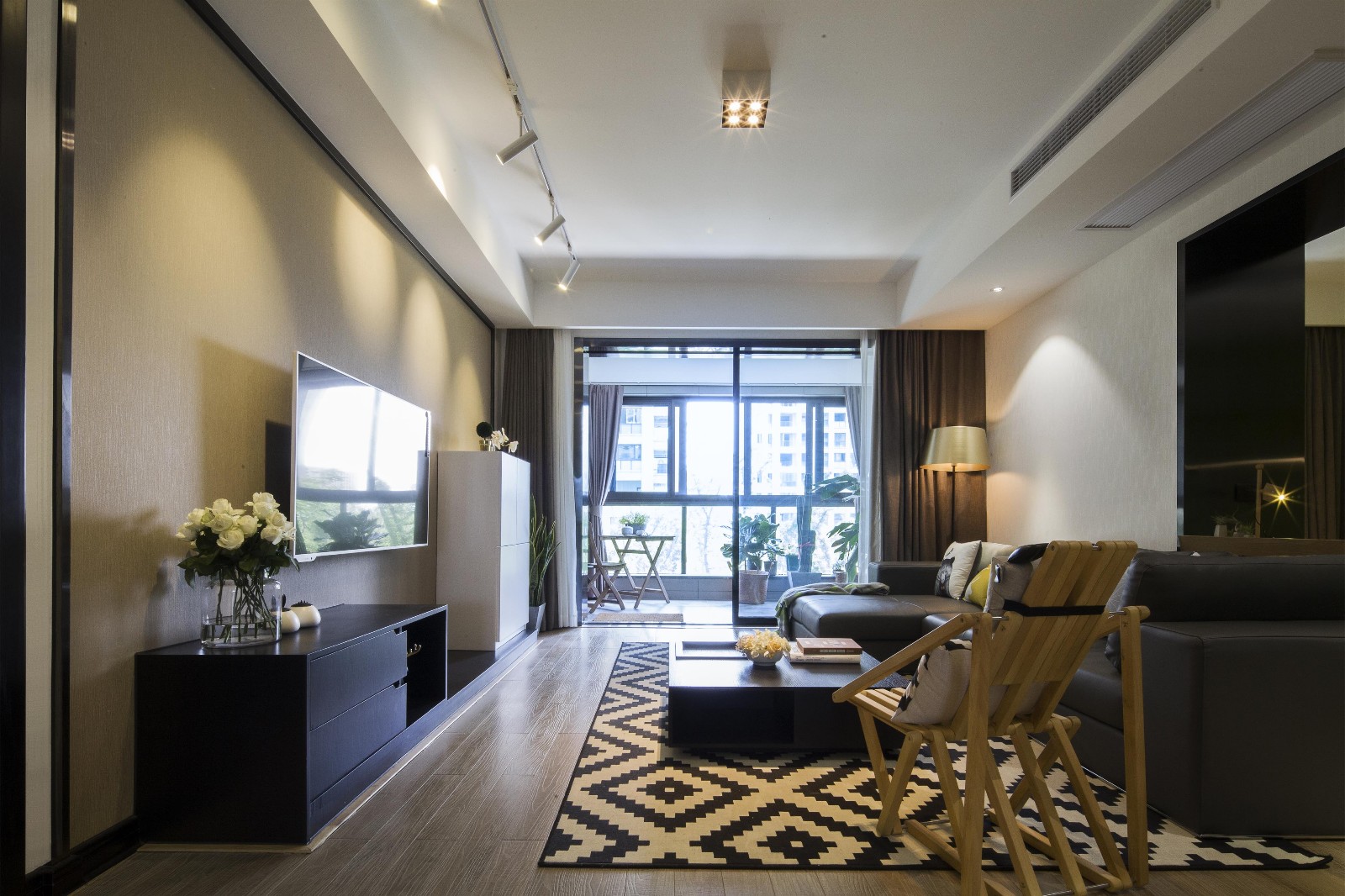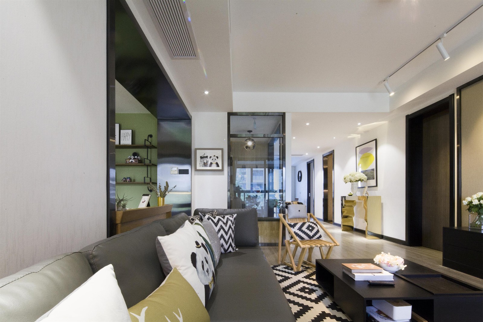 客廳后面是敞開式書房,出挑的黃色沙發為空間帶來一抹亮色,