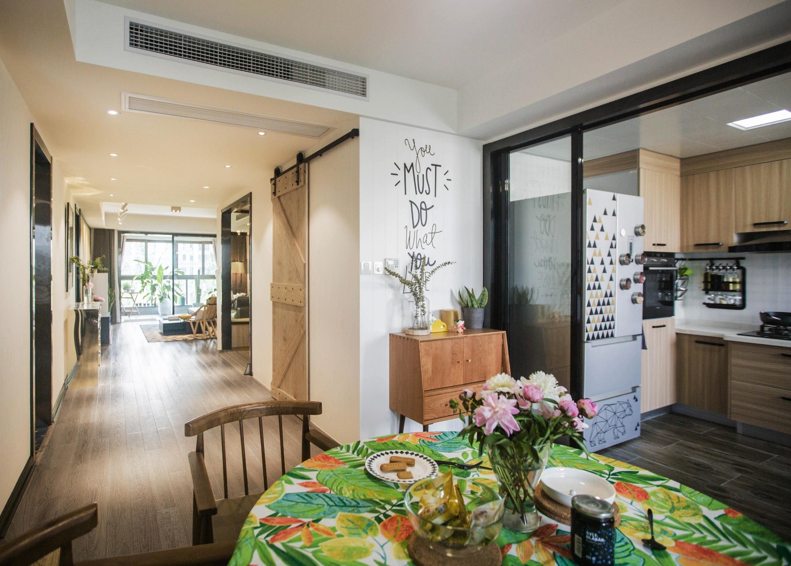 客廳后面是敞開式書房,出挑的黃色沙發為空間帶來一抹亮色,綠色和黃色的組合搭配自然又不乏暖意,墻面的大紅色裝飾畫點綴在視覺上也更有層次感,閑暇時余躺在沙發上看書,或是發呆。文藝到骨子里。