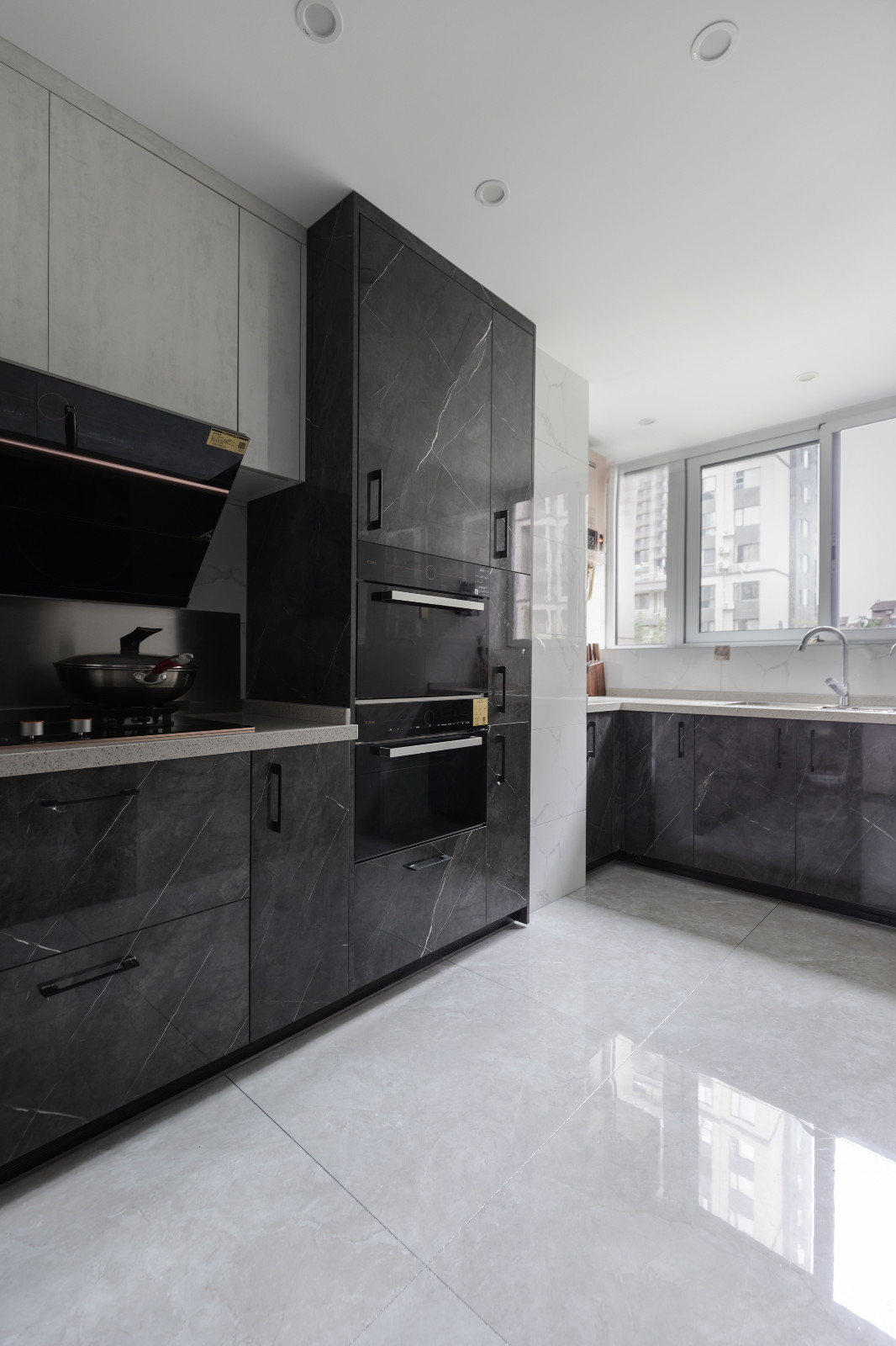 L型開放式廚房設計,充分利用轉角空間,合理布局。白色吊柜柜門+墻磚,搭配木紋櫥柜,色彩清爽簡約。