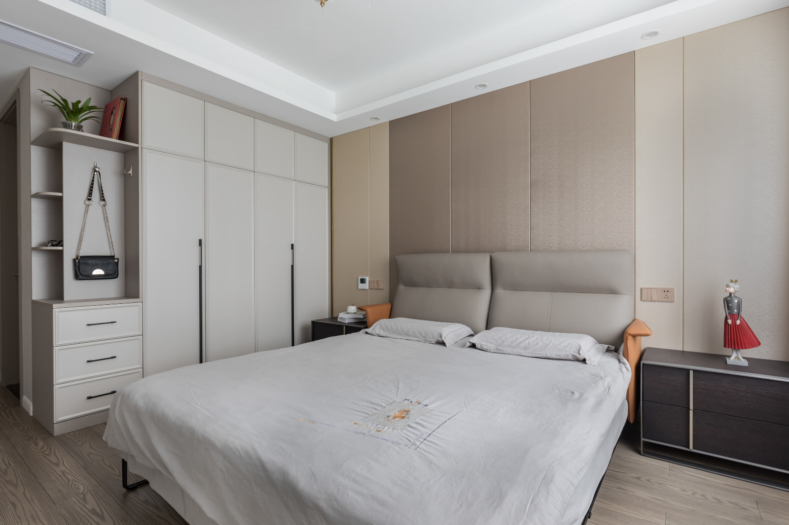 主臥整體灰調,淺色灰背景墻,搭配深灰色皮質床靠背,棕色木紋家具經典。