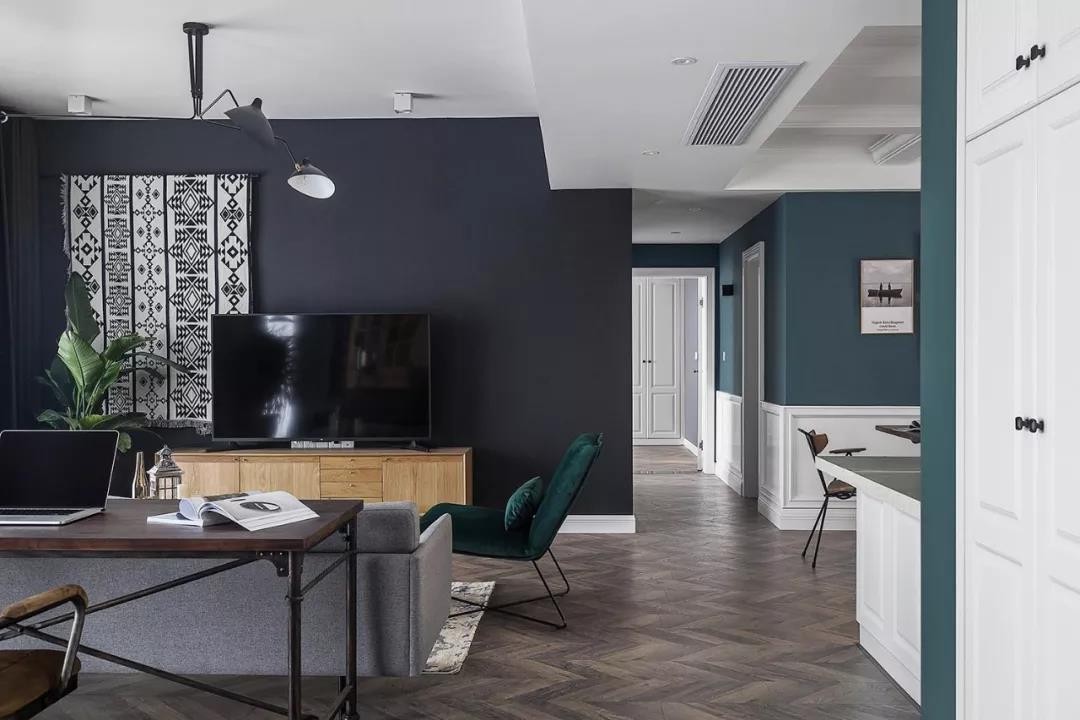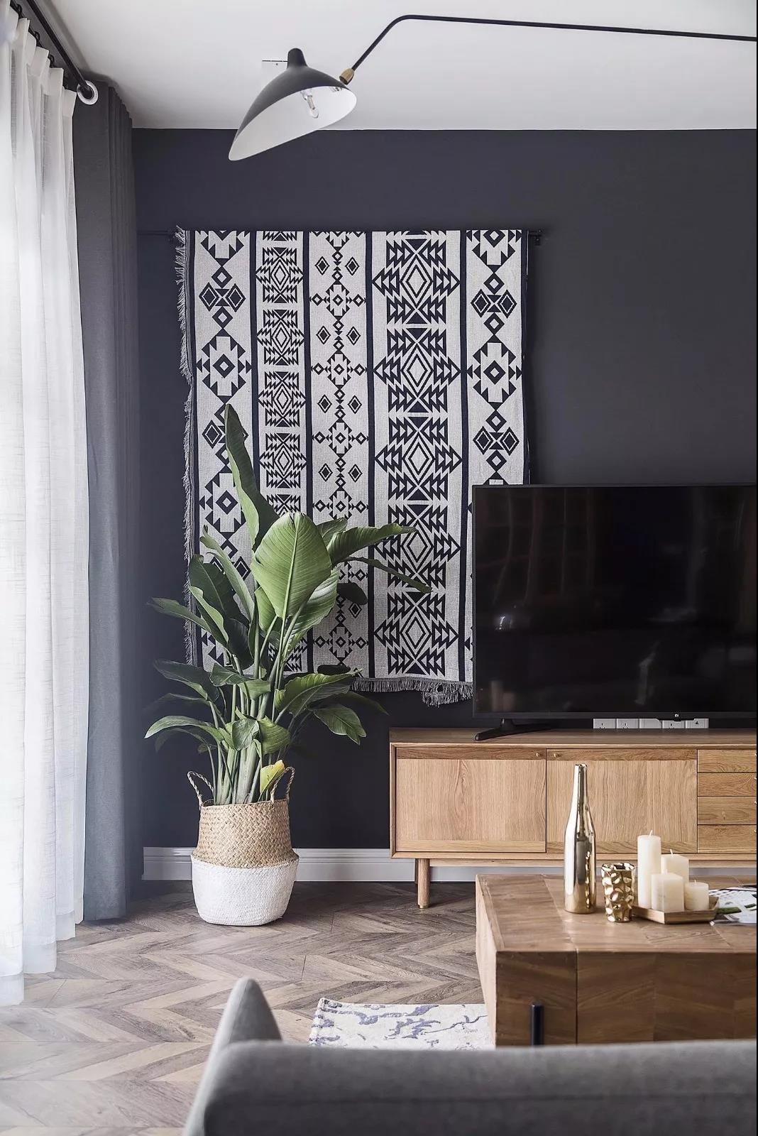 電視墻的設計也很有特色,在偏左的地方掛上一塊黑白相隔的毯子,在深灰色的電視墻上做了一個視覺沖擊的一個設計,讓電視墻看起來不單調,有個性。