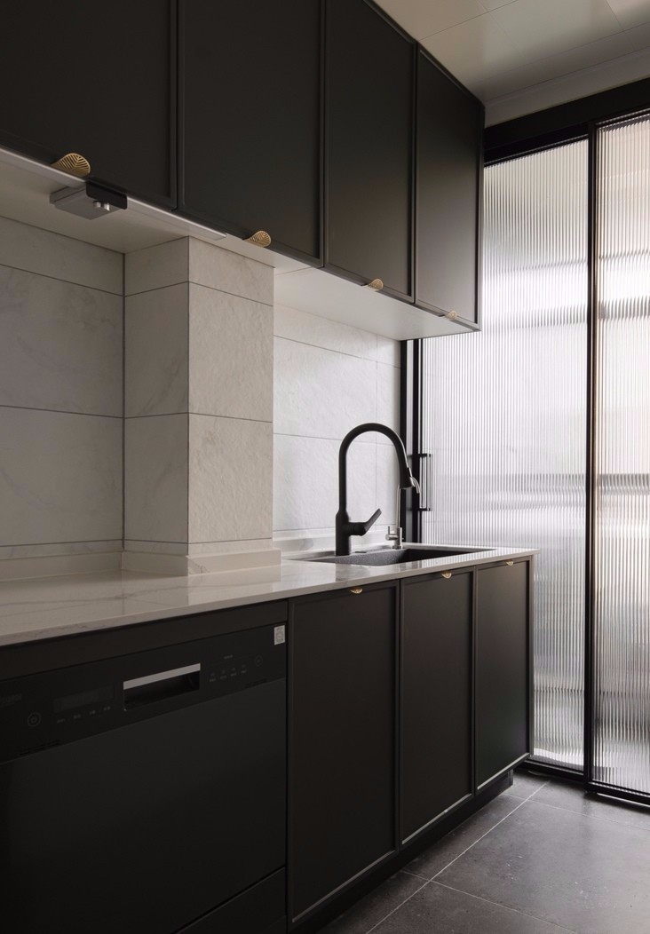 客廳空間以白色為主色調,融入墨綠、酒紅、臟粉等低飽和度彩色,為空間增添了繽紛、動感的視覺效果。